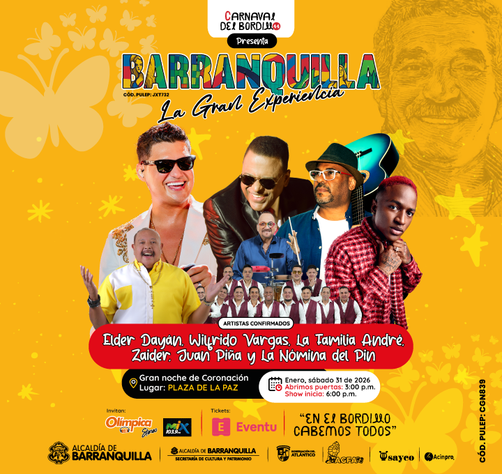 BARRANQUILLA LA GRAN EXPERIENCIA31 de enero del 2026 Barranquilla MAS INFORMACION BESTIVAL 202614 de febrero del 2026 Puerto Colombia MAS INFORMACION Comparsa de FantasÃa KEVARAQ14 de febrero del 2026 Barranquilla MAS INFORMACION FURIA SALVAJE-GUACHERNA06 de febrero del 2026 Barranquilla MAS INFORMACION KZ BAJO EL PALO E' MANGO15 de febrero del 2026 Santa Marta MAS INFORMACION SeguirSeguirSeguir PUNTOS AUTORIZADOS ¿Tienes alguna duda? Nombre Correo electrónico Teléfono Celular Mensaje Enviar
